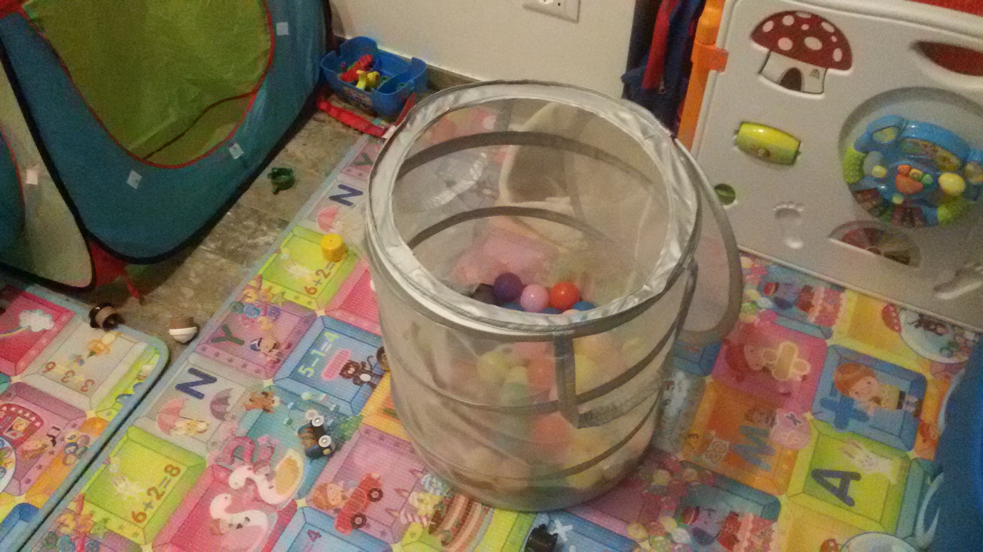 Canestri e rimandi: Samuele era seduto dentro al porta biancheria di ikea e io da fuori gli tiravo le palline, cercando di fare canestro, nel tentativo di sommergerlo con tutte le palline colorate che avevo a disposizione. Lui da dentro le ributtava fuori. Scopo del gioco: vince chi rimane con meno palline in mano. Lo stesso gioco, con modalità diverse, si può proporre, ad esempio in una festa di compleanno, formando squadre da due bambini e dividendoli in coppie di squadra mista (uno nel canestro ikea e l’altro fuori). Ci sarebbero così condizioni di doppia vittoria, di doppia perdita e di parità.
