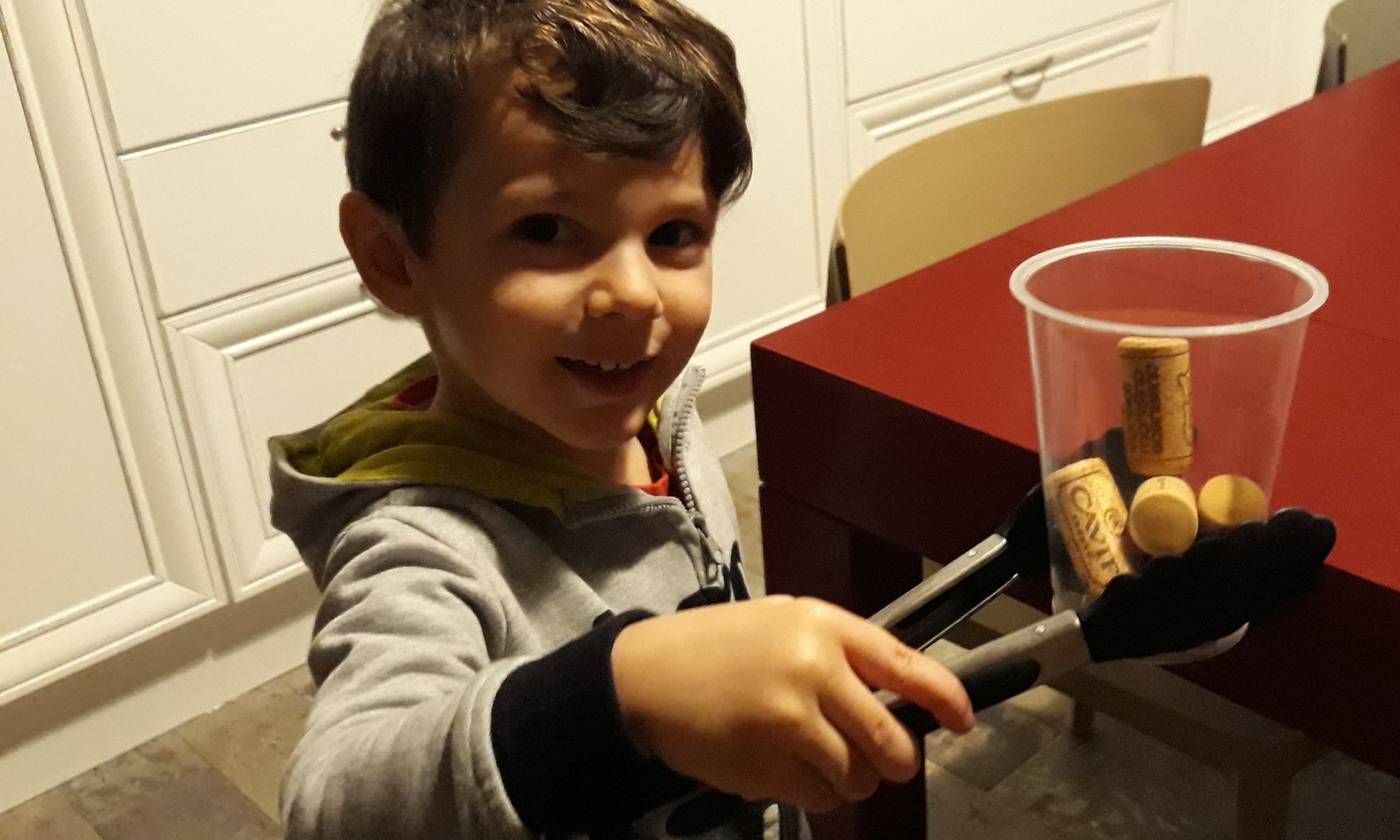 2) invitare il bambino a prendere con la pinza un tappo alla volta, da mettere nel bicchiere di plastica, senza far cadere né quello che sta prendendo né quelli da prendere.