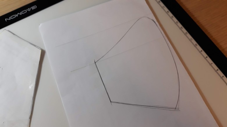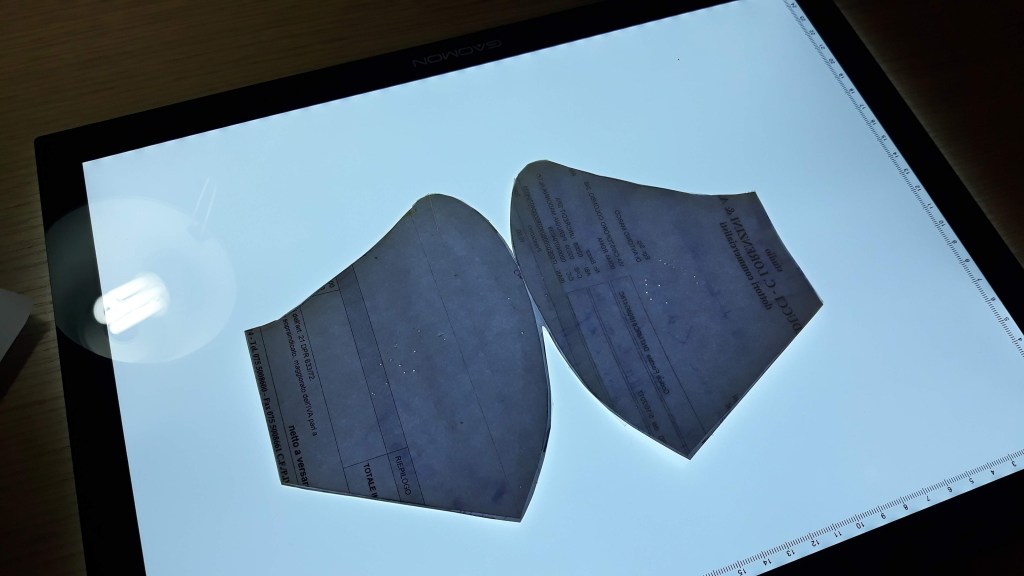 Prendete un altro foglio di carta A4 (come vedete io utilizzo carta da riciclare) e mettetelo sopra al carta modello della mascherina per adulti finita. Se avete una tavoletta luminosa come la mia, questa è una delle occasioni più utili in cui utilizzarla. Se non ce l’avete e volete acquistarla, io presi questo modello su Amazon, ancora disponibile alla data in cui scrivo, a questo link. Se non ce l’avete e non la volete comprare, un qualunque vetro di finestra di casa vostra andrà benissimo …purché sia giorno o abbiate, come noi, almeno un lampione esattamente davanti al vetro!