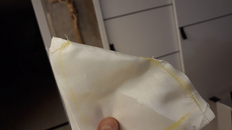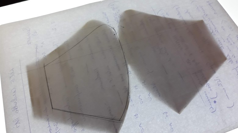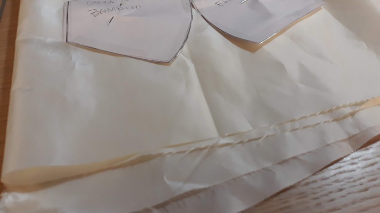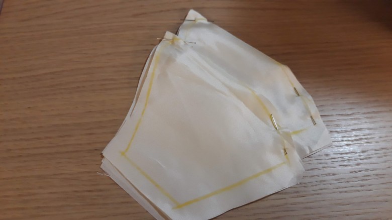 Fissate il cartamodello al tessuto così piegato e disegnate con un gesso da sarto (se non lo avete va bene anche una penna) il contorno della vostra mascherina sul tessuto piegato. Tagliate il tessuto per tutto il contorno (tutti gli strati insieme senza spiegarlo!), lasciando circa 1 cm di tessuto libero dal bordo disegnato a contorno del cartamodello. Staccate il cartamodello e, se avete effettivamente piegato il tessuto più volte, mettete da parte i primi due strati. Posizionate nuovamente il cartamodello sugli strati rimasti (nel mio caso altri 2 – vedi foto sotto) e ripetete l’operazione di disegno del contorno per poi mettere da parte i successivi due strati ogni volta. Ripetete questo passaggio in sequenza fino ad esaurire le coppie di tessuti tagliati che, in questo modo corrisponderanno al numero di mascherine che otterrete alla fine.