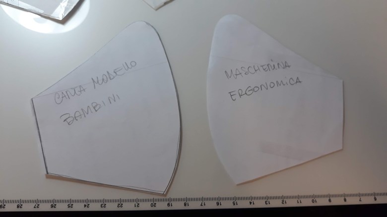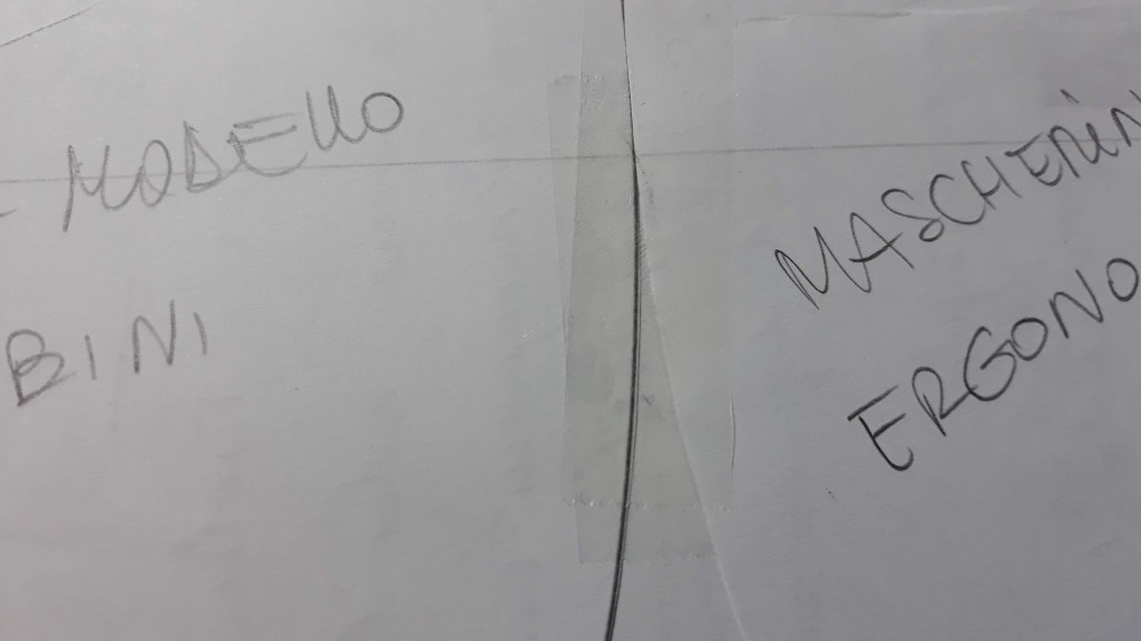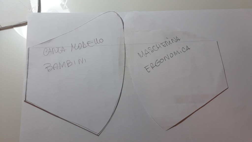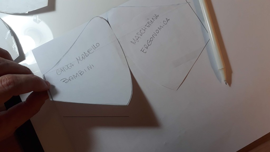 Ottenuto il definitivo di quello per adulti (non guardate per il momento le scritte a matita sulle foto sopra), passiamo al carta modello della mascherina per bambini. Io l’ho misurata e collaudata sul viso di Samuele che ha 4 anni e mezzo tra poco, ma ritengo vada bene fino agli 11-12 anni, indipendentemente dal sesso.