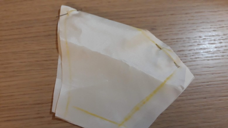Per ogni coppia, abbinate un dritto di semilavorato del primo tessuto a un dritto di semilavorato del secondo (vedi foto 1 del gruppo foto qui sotto). Se li avete disposti bene, davanti a voi vi troverete il rovescio del tessuto (ambo i lati) con il bordo disegnato all’inizio! Se non è così, maneggiateli fino ad ottenere questo risultato visivo. Raggiunto l’obiettivo, con gli spilli fissate le due coppie di tessuto tra di loro, sopra e sotto, stando attenti al fatto che ogni spillo viaggi in corrispondenza del tratto disegnato sul tessuto da ambo le parti. Lasciate LIBERE le estremità laterali perché quella è la tasca nella quale chi vorrà potrà inserire ulteriori strati di protezione a questa mascherina! (Tutti gli spilli vanno inseriti in un solo verso: se cominciate da destra a sinistra, o viceversa, non cambiate direzione perché altrimenti in fase di cucitura a macchina sarà un pasticcio…).
