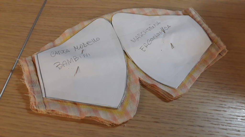 ATTENZIONE: in mancanza di quest’ultima accortezza (percorrere esattamente il tratto disegnato con gli spilli ambo i lati, lasciando libere le estremità laterali), la mascherina potrebbe NON essere poi indossabile, NON essere perfettamente ergonomica, NON calzare bene, ecc.