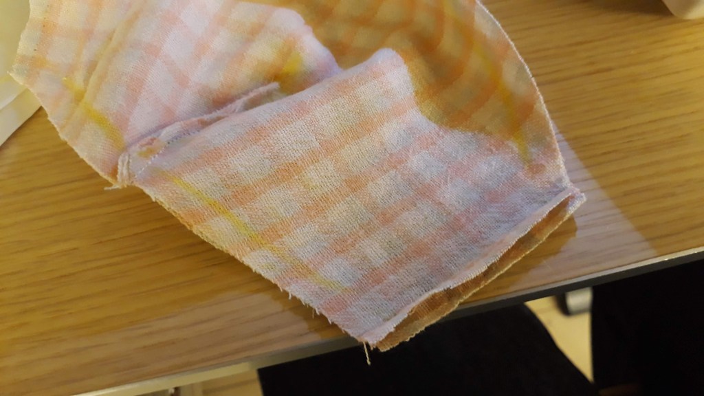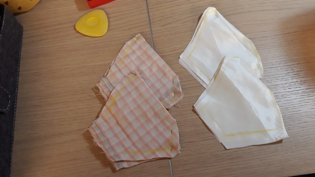 - Cotone resistente (potete riciclare qualche vecchio tovagliolo o lenzuola rotte) e fodera (quella classica che si usa per l’interno dei vestiti: se voi non li portate, chiedete qualche vecchia gonna o qualche avanzo a nonne e zie, chi cerca trova!).