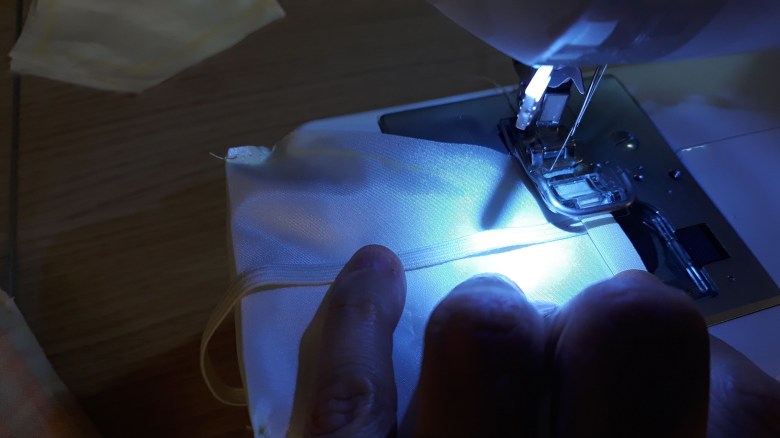 Riprendete ora il gruppo di semilavorati del primo tessuto (fodera bianca) che, ricordiamolo, corrisponde alla parte esterna, quella a vista della mascherina, per cucire gli elastici che saranno agganciati alle orecchie quando si indosserà. Come l’ultimo passaggio appena descritto per la rifinitura dei bordi laterali del secondo tessuto (cotone), effettuate la stessa cucitura da cima a fondo, sempre ripiegando il bordo laterale due volte su stesso verso l’interno, con l’aggiunta dell’elastico da fissare a scomparsa sopra e sotto. Per farlo scomparire sotto alla piegatura del bordo laterale, inseritene almeno 3-4 mm dopo la prima piegatura in alto e altrettanti in basso. In questa fase dovrete coordinare tre abilità: cucire, tenere bene il tessuto (soprattutto la fodera che è capace di fare un sacco di danni!) mentre cucite e infilare l’elastico stando attenti al fatto che non se ne esca o non cambi sede, mentre cucite. Che si fa se si sbaglia? Si scuce piano piano a mano e si ripete. Questo vale sempre.