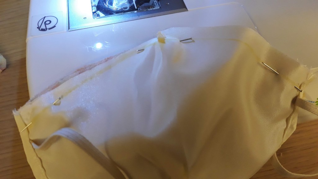 Piegate e fissate con gli spilli tutte le coppie di tessuto a vostra disposizione, potete effettuare una prima cucitura (a macchina o, se non l’avete, a mano) per definire (in sartoria si dice per cucire le due “riprese”) e ultimare la parte frontale della mascherina (naso e mento) che con queste prime due cuciture, nell’attesa di essere ultimata, sarà anche meno soggetta a spostamenti fortuiti o involontari del tessuto. Guardando bene le foto qui sopra e qui sotto, che potete ingrandire cliccandoci sopra, noterete che gli spilli sono posizionati nel verso del tratto disegnato in precedenza. Ecco, NON E’ UN CASO: gli spilli si mettono sempre in corrispondenza di questo tratto perché servono a far combaciare esattamente il lato davanti a voi con quello sotto che, mentre cucite, non vedete.
