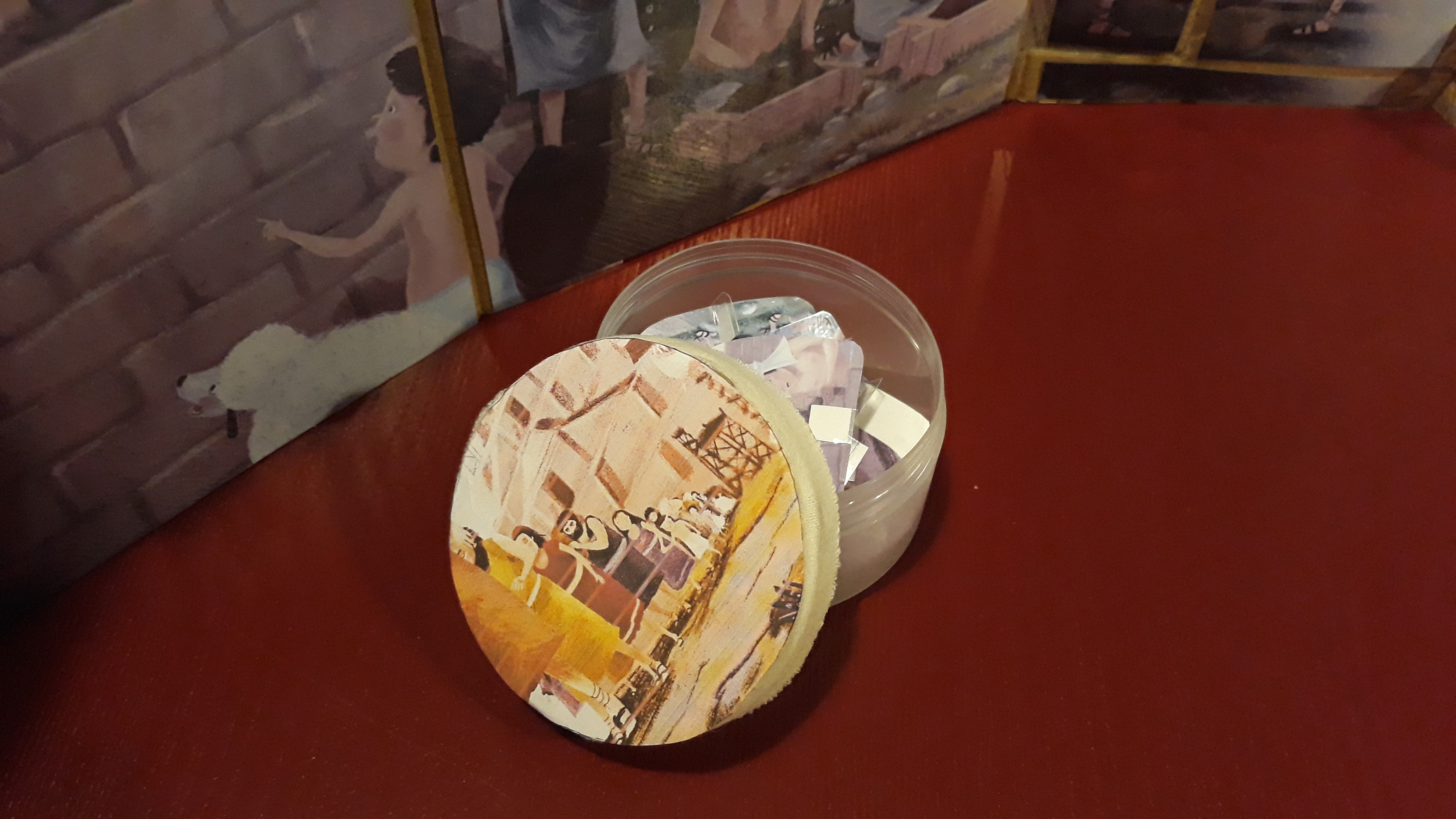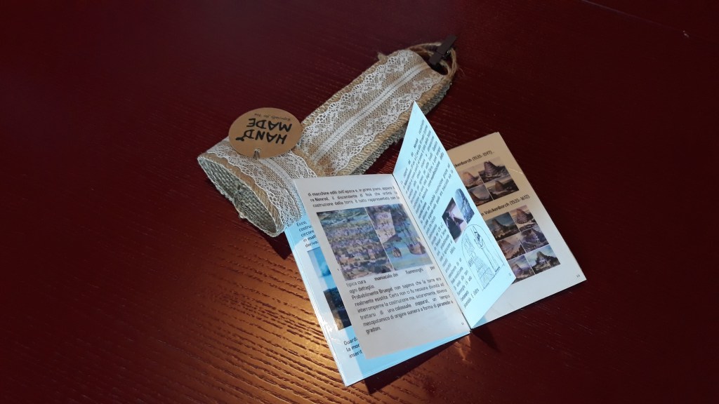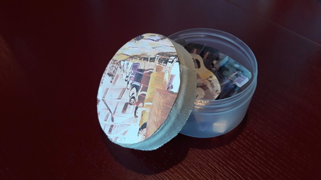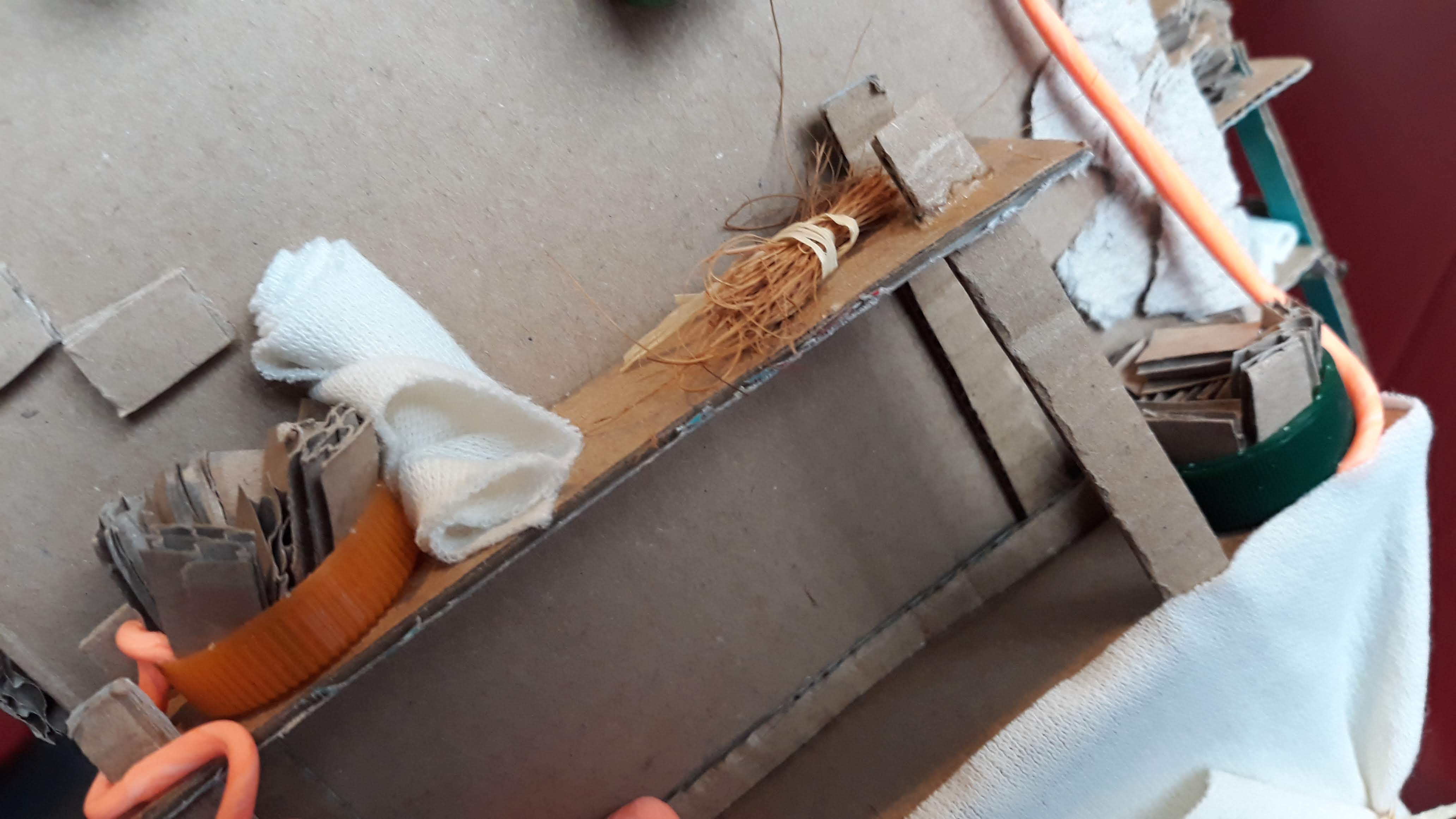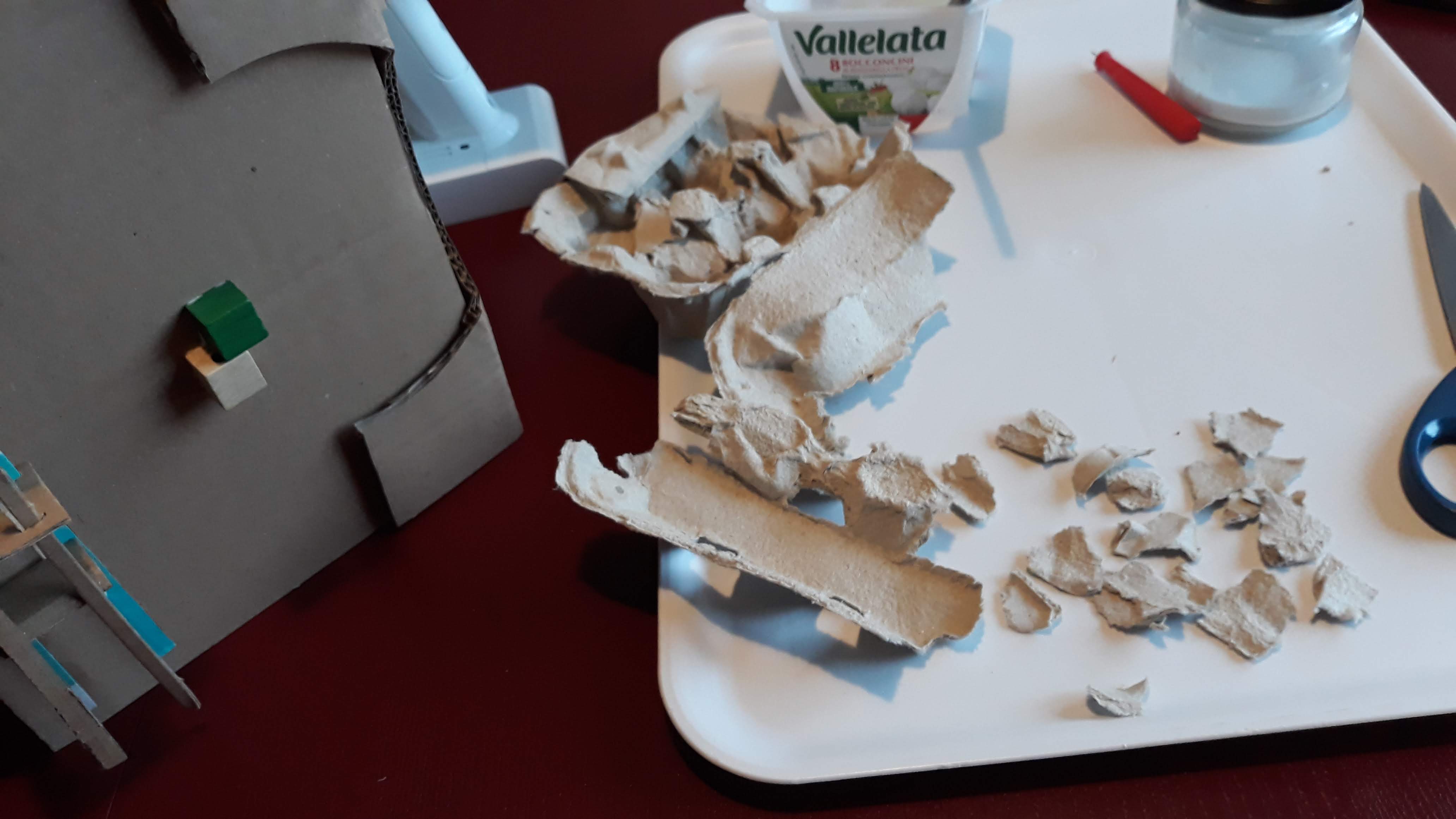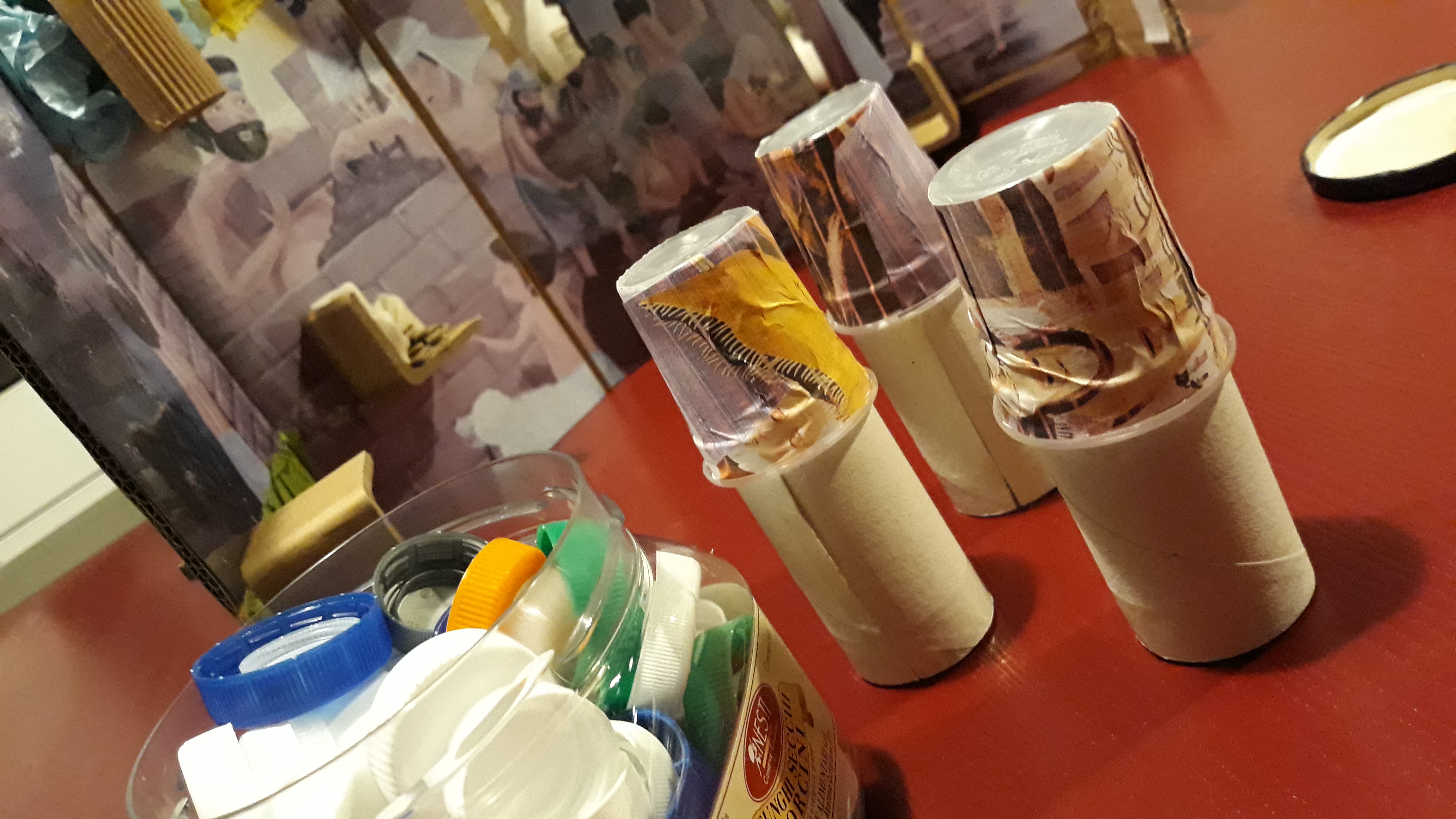 I contenitori dei tangram (3 di diversa difficoltà: facile, media e difficile) sono rotoli di carta igienica chiusi sul fondo con tappi di plastica a misura e sulla cima con vasetti di plastica vuoti di Didò. Sopra ai vasetti che chiudono il contenitore, abbiamo incollato tre materiali (cartoccio, cartone ritagliato e rete delle arance) che potessero rendere l’idea di alcune materie prime di pertinenza del tempo e della storia: la roccia, i mattoni e le reti.