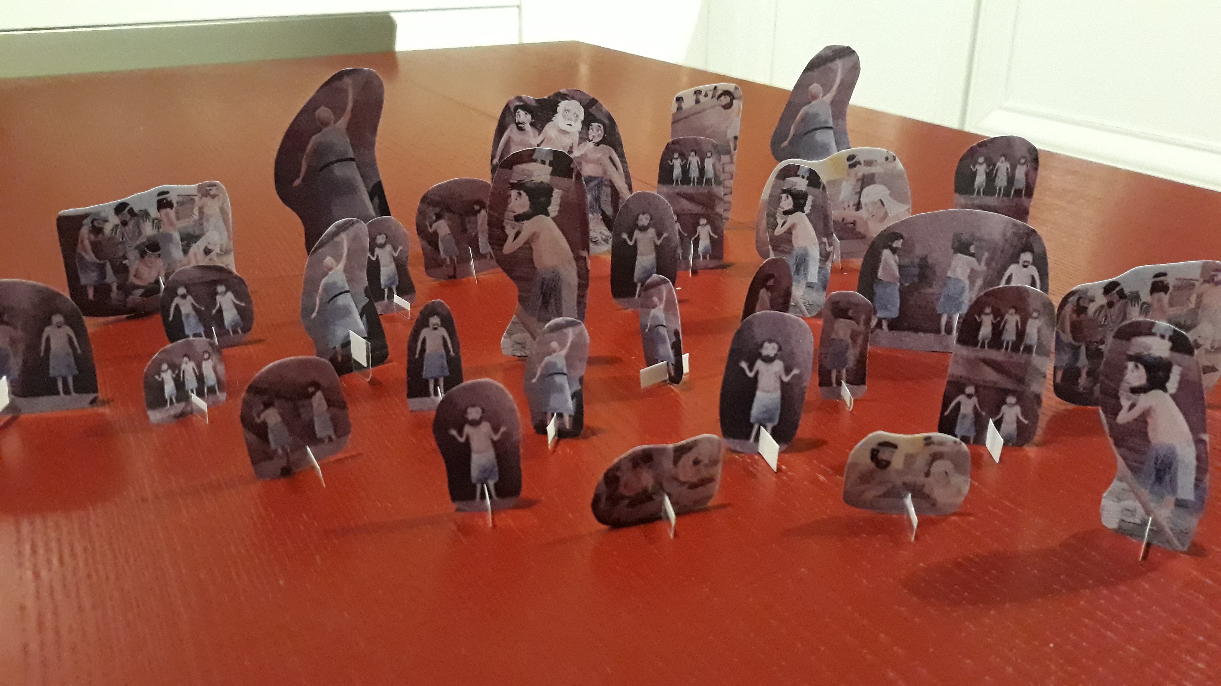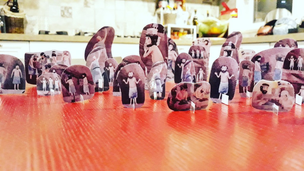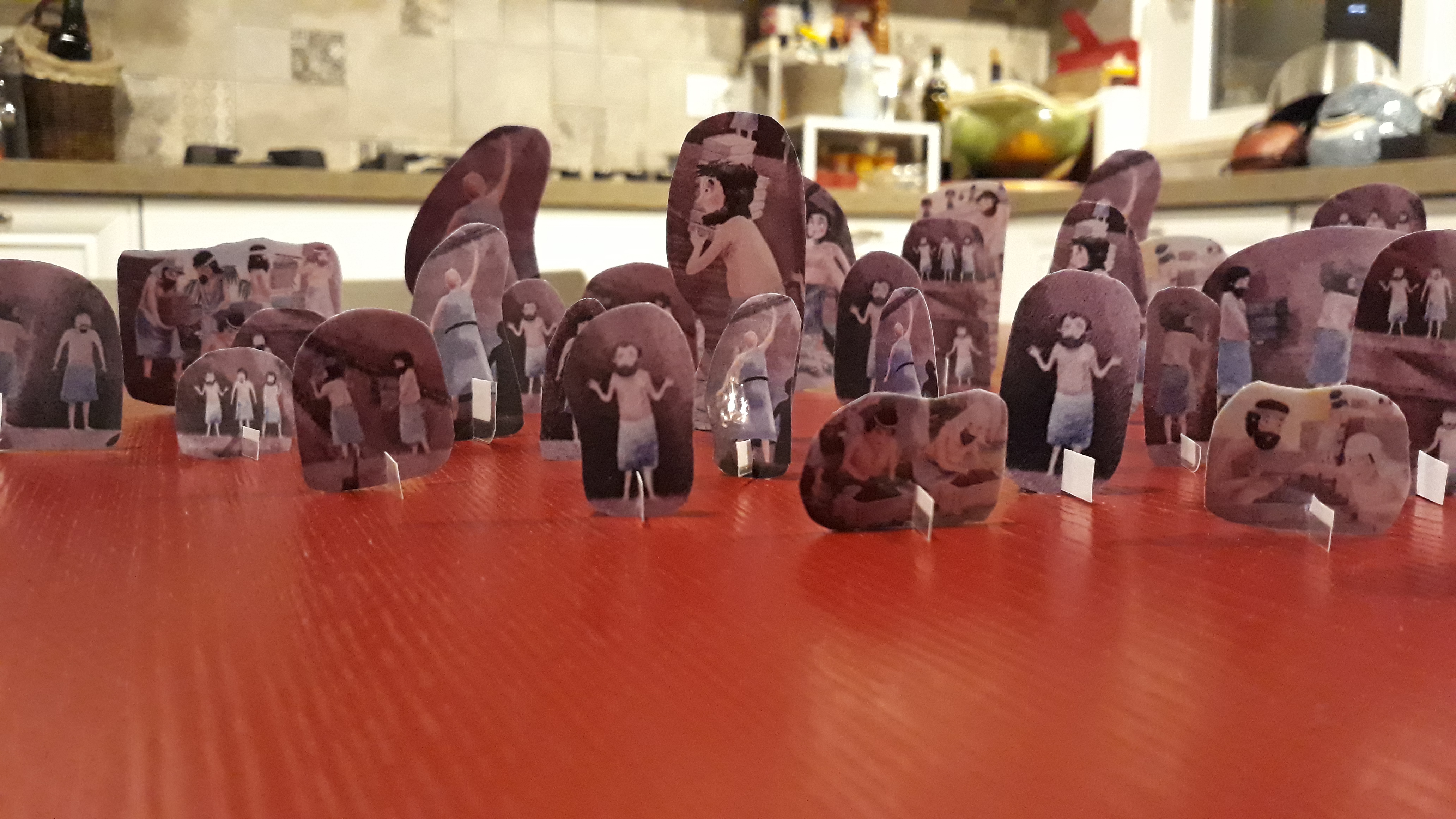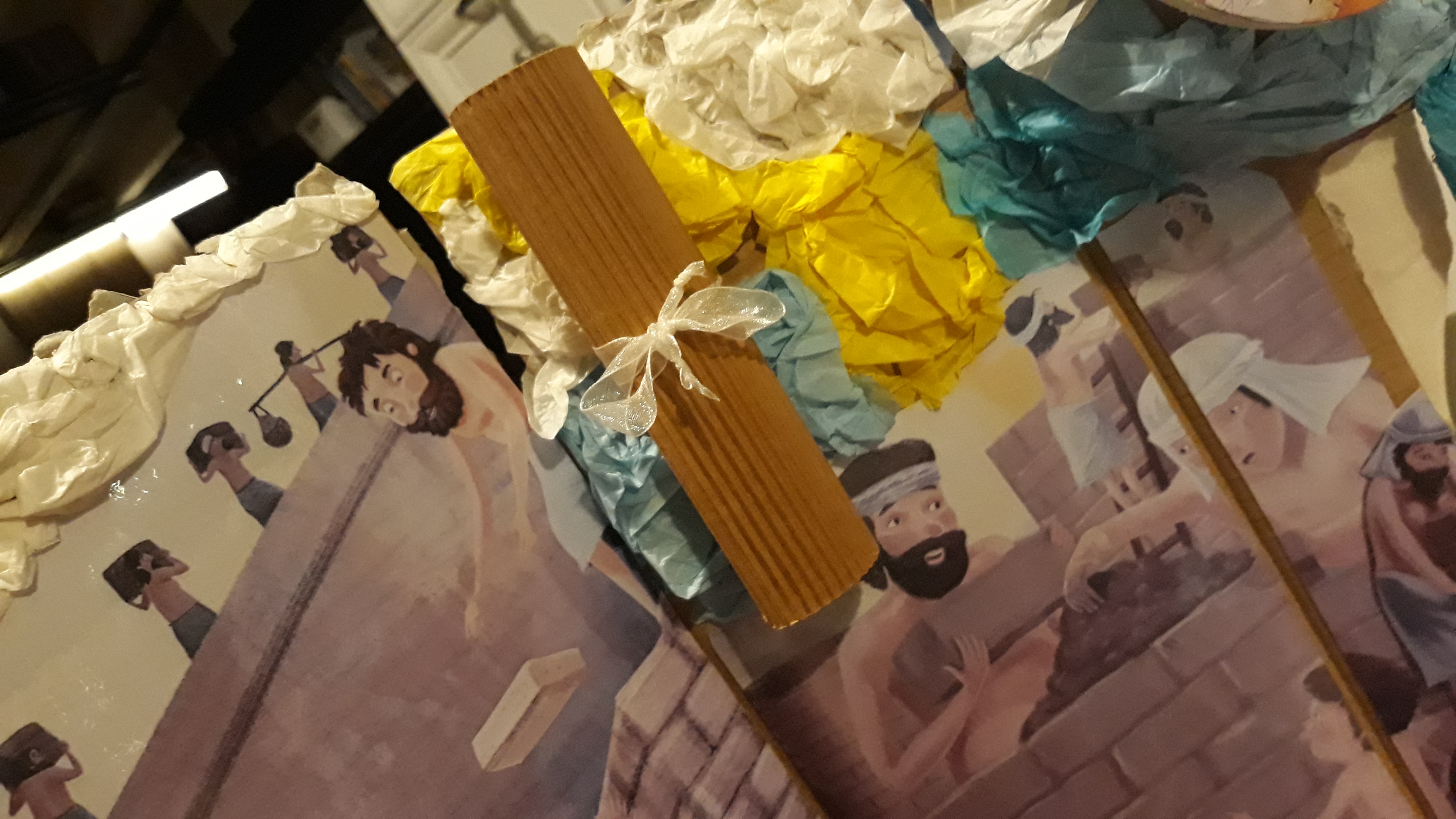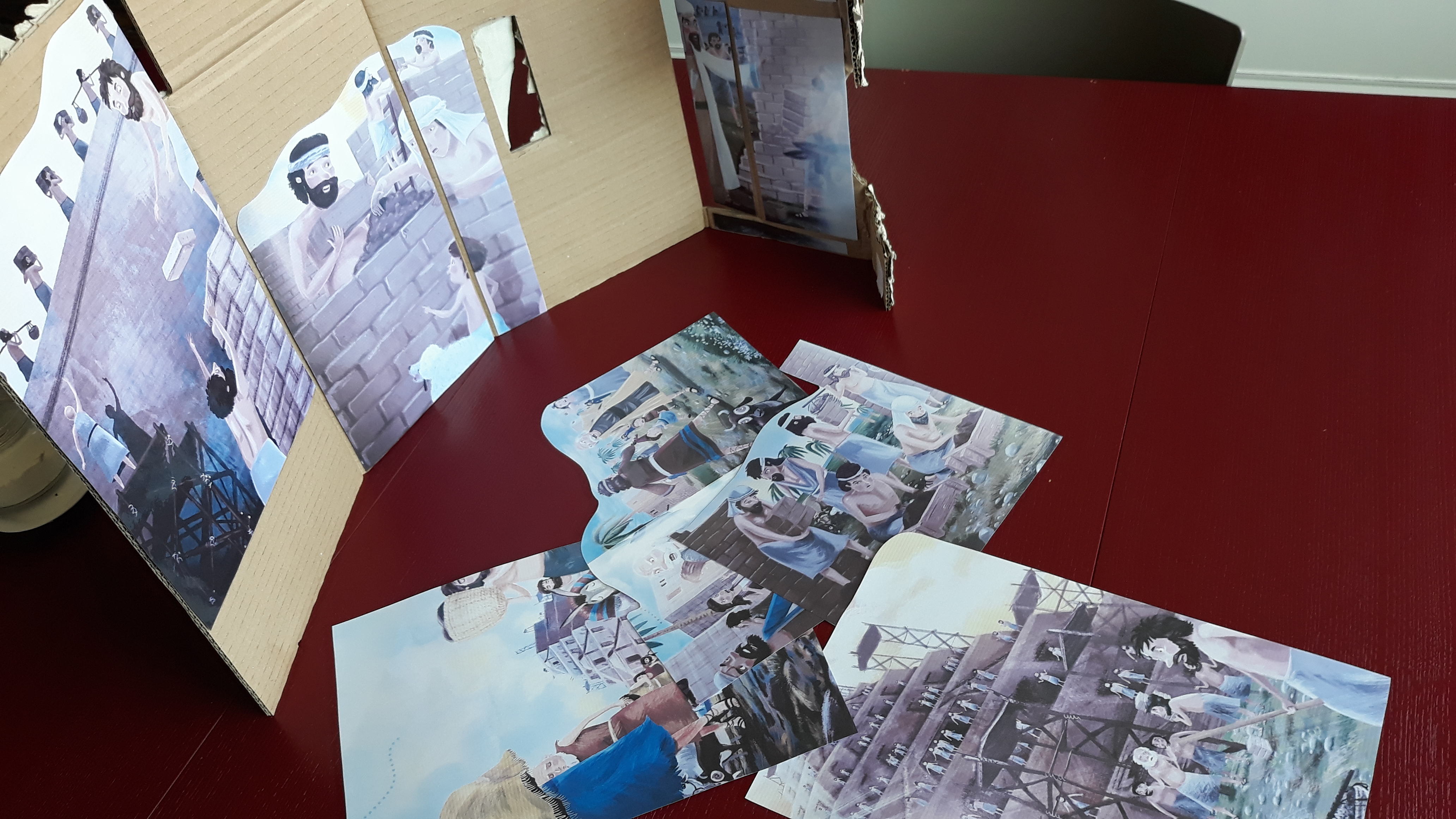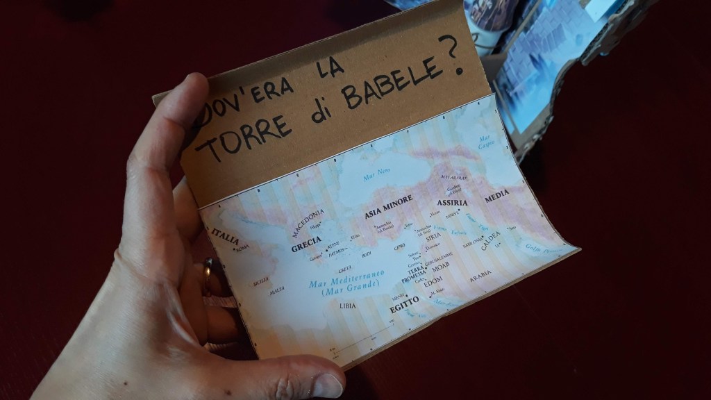 Per cominciare le illustrazioni di questo episodio proposte dalla nostra bellissima raccolta sulla storia della salvezza: “La mia prima Bibbia”. Le abbiamo fotografate bene dal libro, stampate in formato A4 per poterle incollare come sfondi all’interno della nostra torre e plastificate – prima di incollarle – per renderle maggiormente durevoli. Abbiamo anche copiato e incollato più immagini dei personaggi, dimensionati in proporzione alla torre, per poterli poi ritagliare e utilizzare come attori di questo bellissimo scenario – plastificati anche loro.