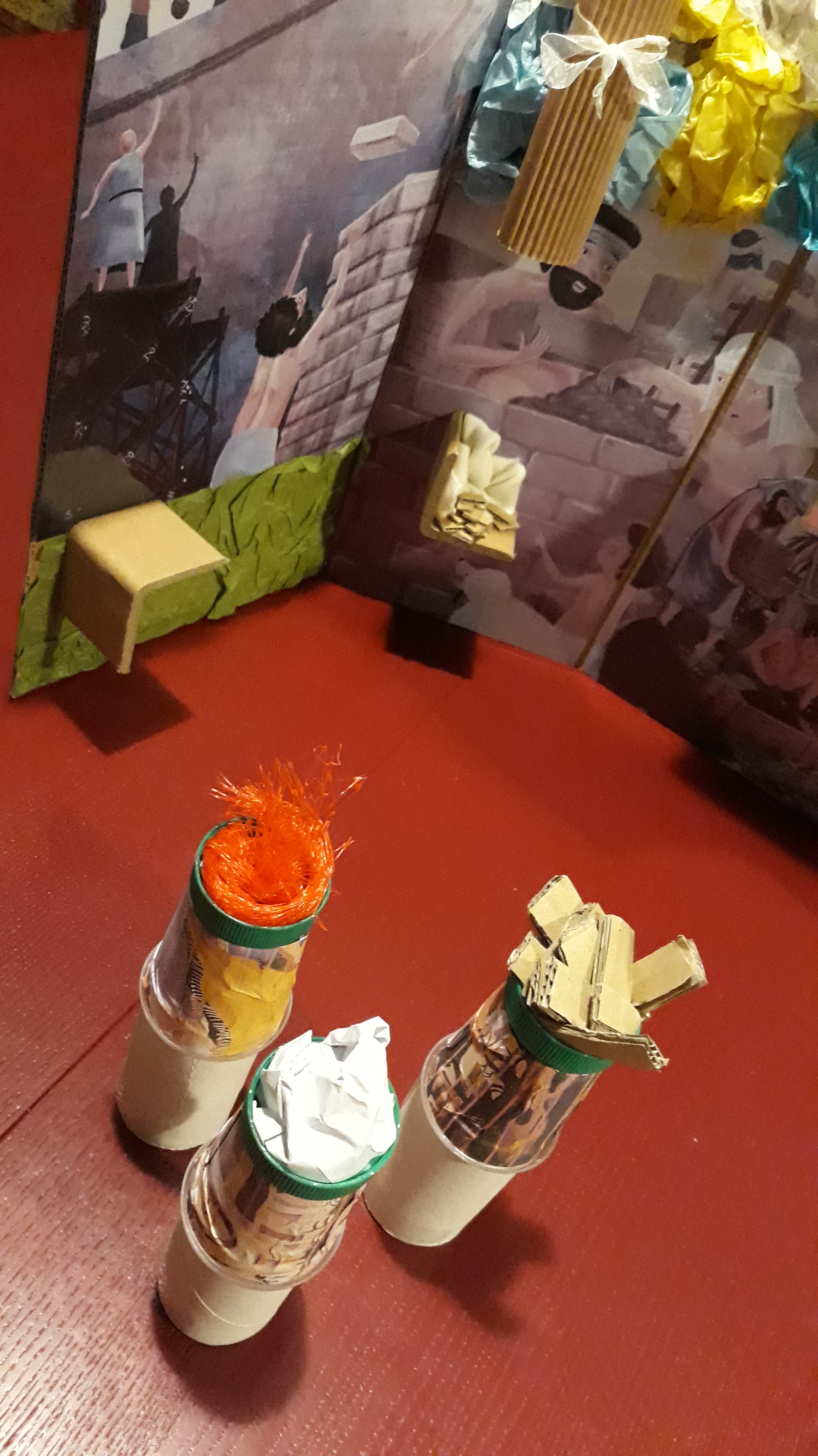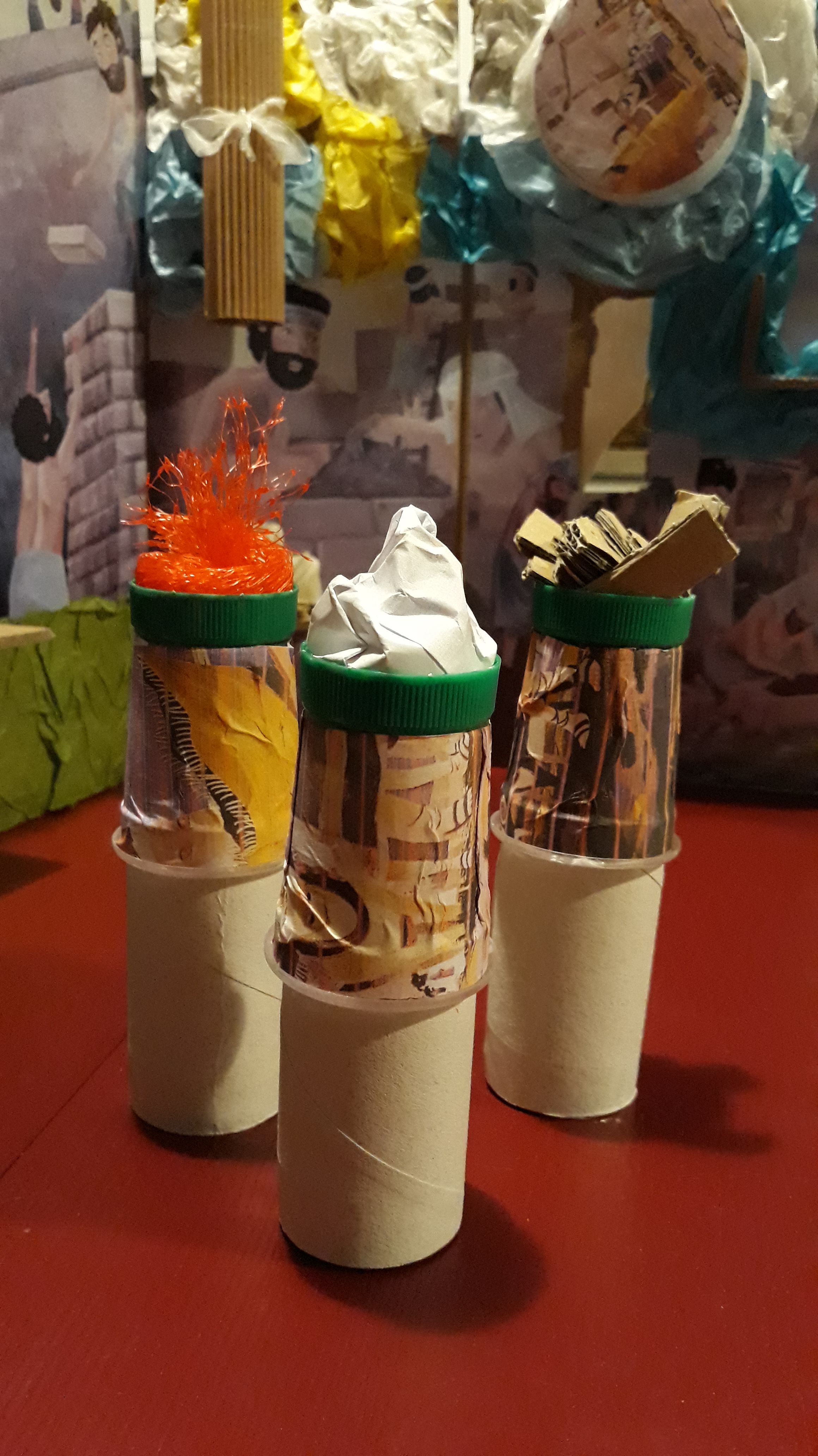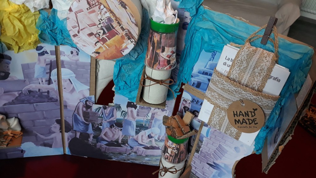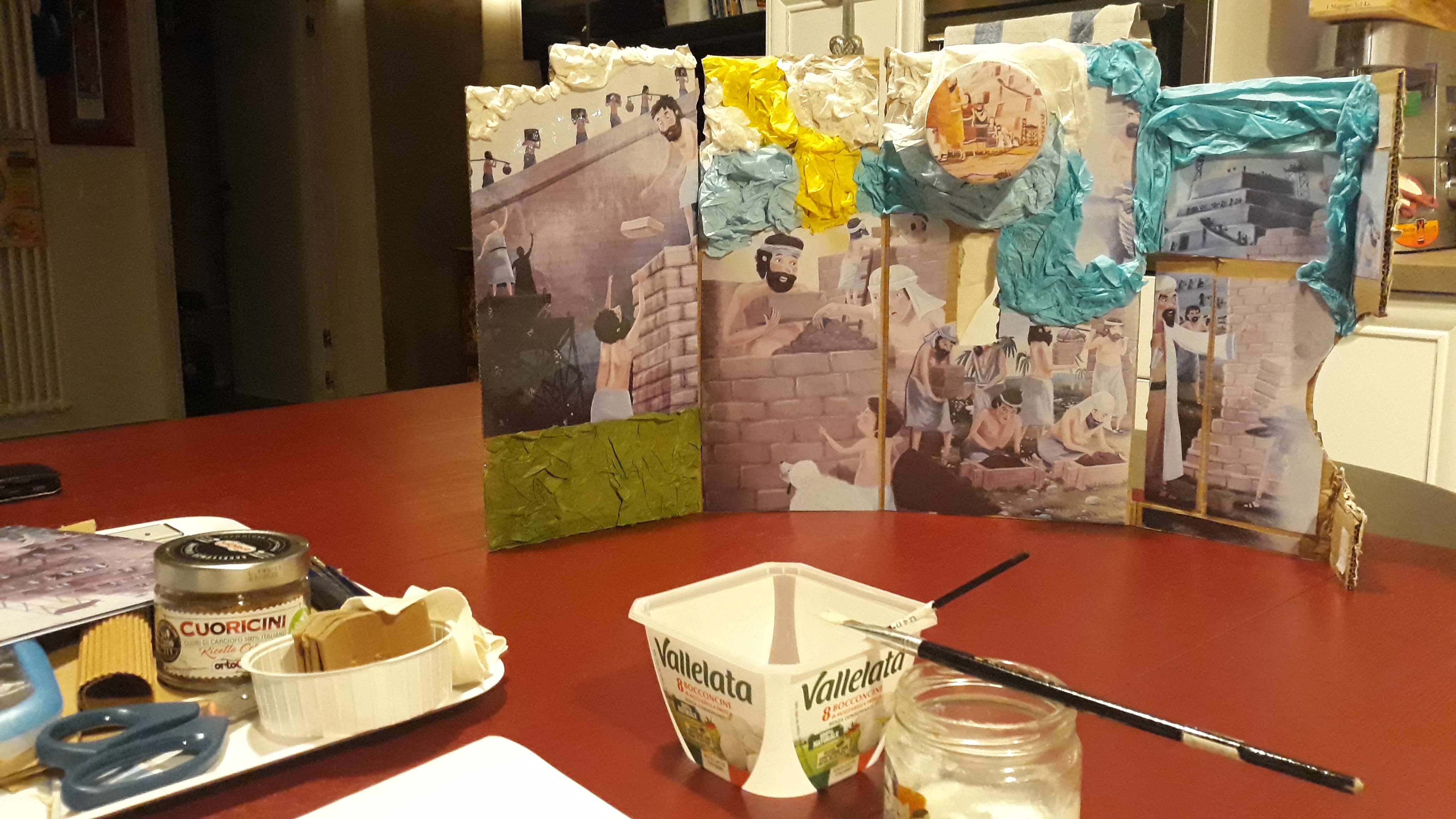 Per il resto, che dire? Tutto materiale di riciclo e roba da buttare, oltre alle solite cose necessarie (pennelli, colle, colori, scotch, forbici…) abbinate a tanta fantasia, tempo, pazienza, manualità, pensiero divergente, errori comuni, progettualità, pianificazione, svolgimento… and so on. Risultato (sempre per ricordarci che TUTTO E’ APPRENDIMENTO): circa due settimane di lavoro multidisciplinare sullo sviluppo di caratteristiche complementari quali teoria e pratica, conoscenza e competenza, organizzazione del lavoro, creatività, arte, storia e religione, oltre che condivisione, collaborazione e cooperazione.