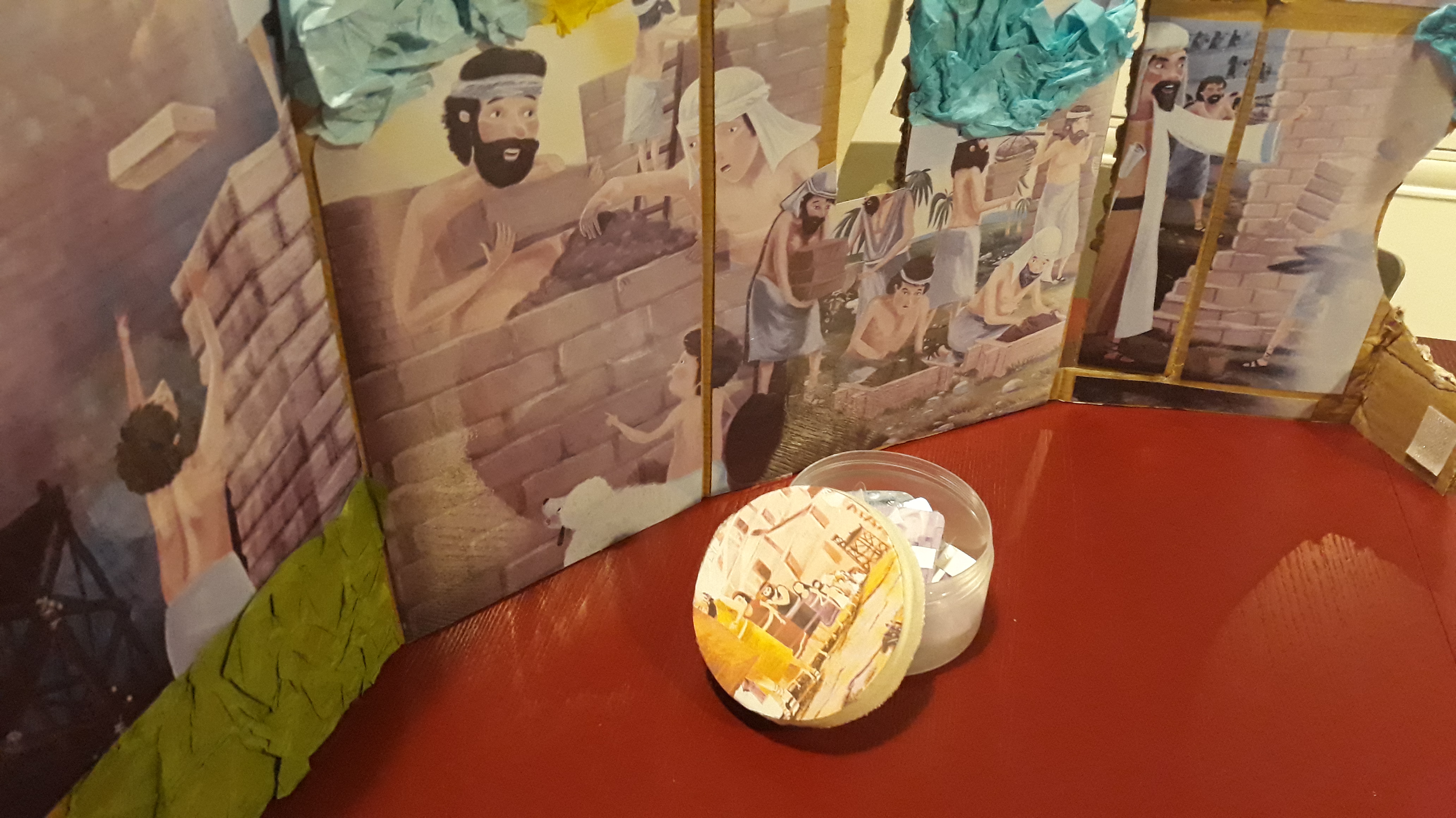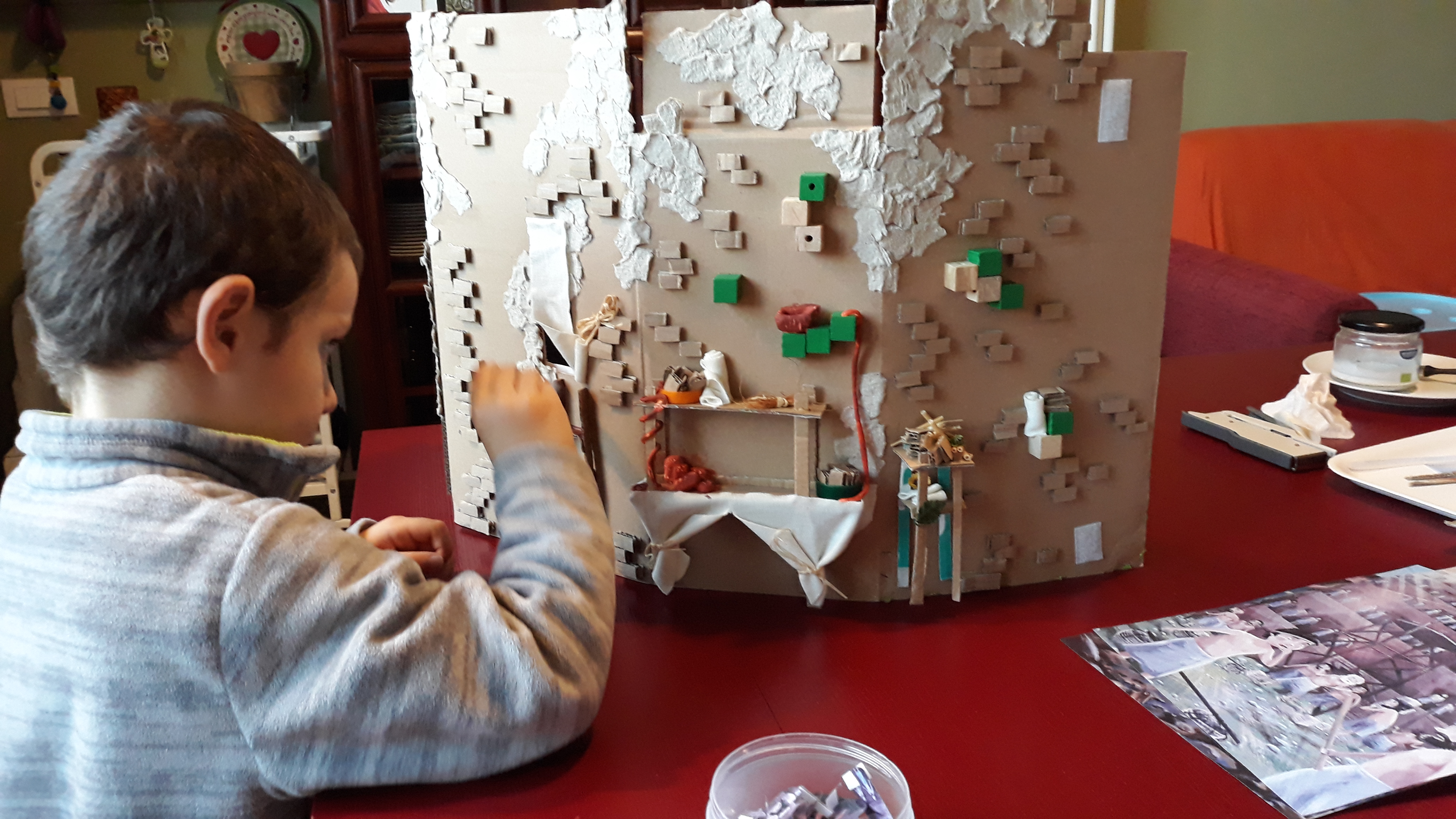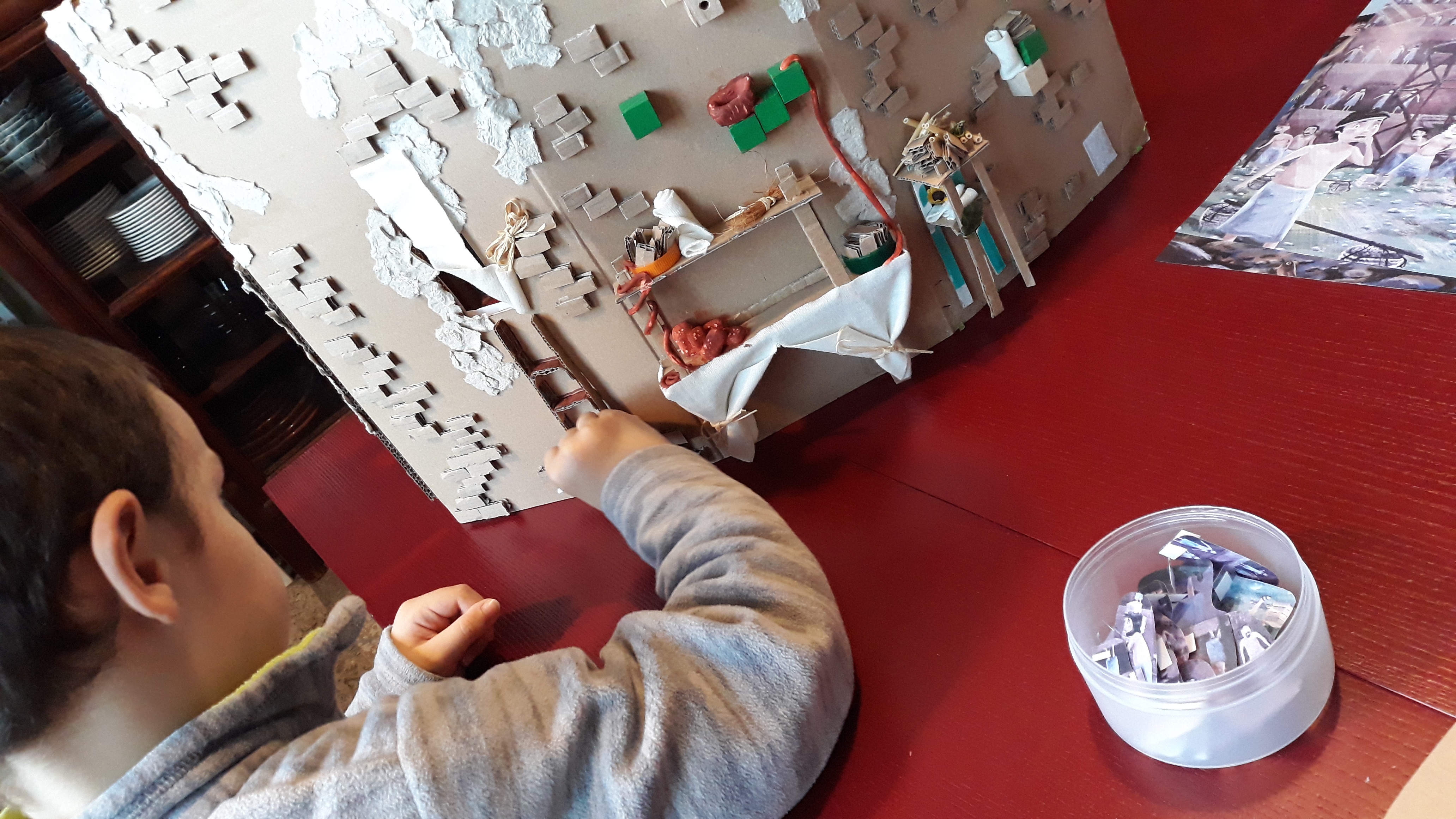 Per il resto, che dire? Tutto materiale di riciclo e roba da buttare, oltre alle solite cose necessarie (pennelli, colle, colori, scotch, forbici…) abbinate a tanta fantasia, tempo, pazienza, manualità, pensiero divergente, errori comuni, progettualità, pianificazione, svolgimento… and so on. Risultato (sempre per ricordarci che TUTTO E’ APPRENDIMENTO): circa due settimane di lavoro multidisciplinare sullo sviluppo di caratteristiche complementari quali teoria e pratica, conoscenza e competenza, organizzazione del lavoro, creatività, arte, storia e religione, oltre che condivisione, collaborazione e cooperazione.