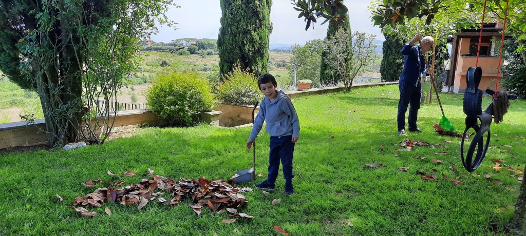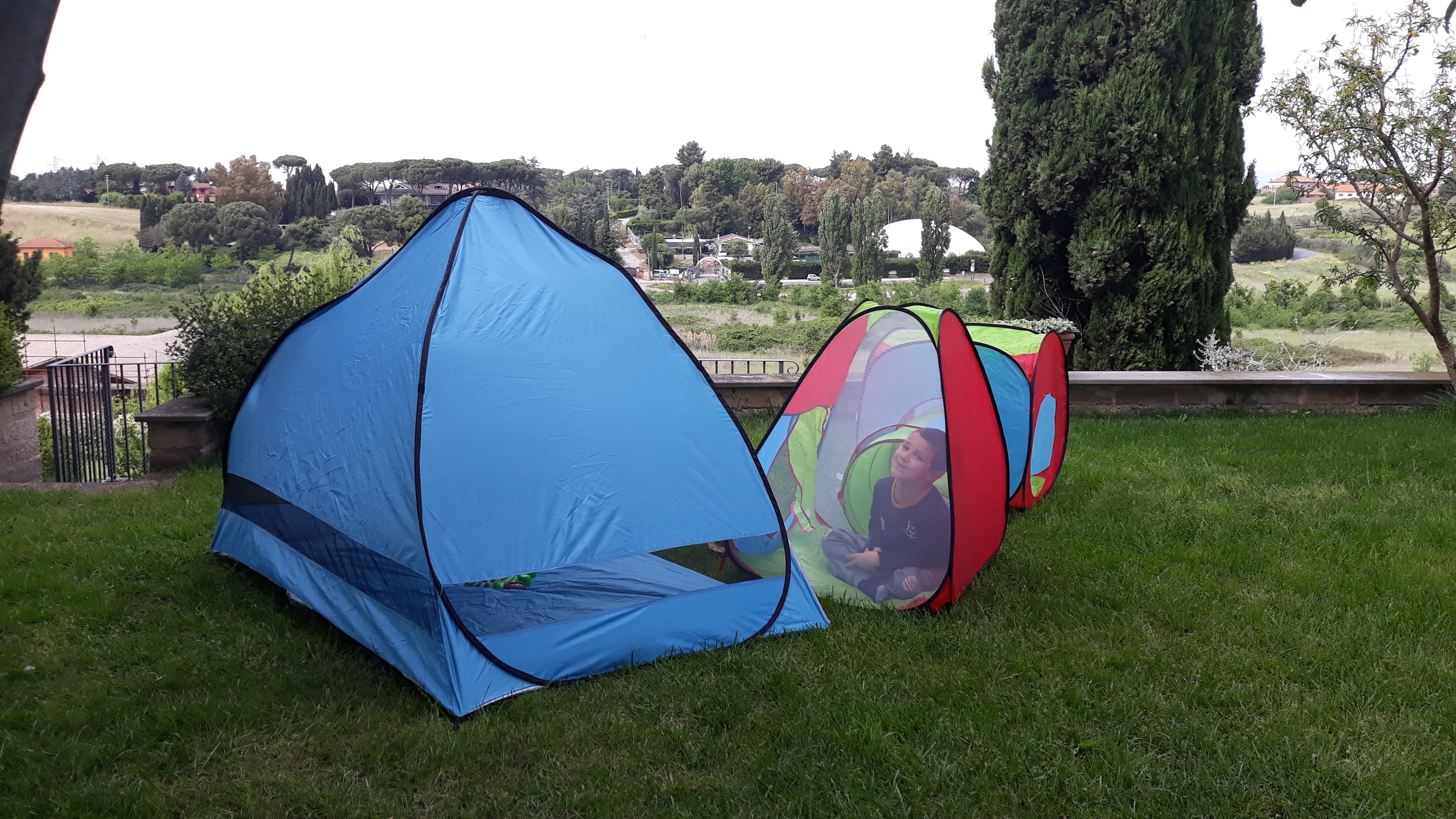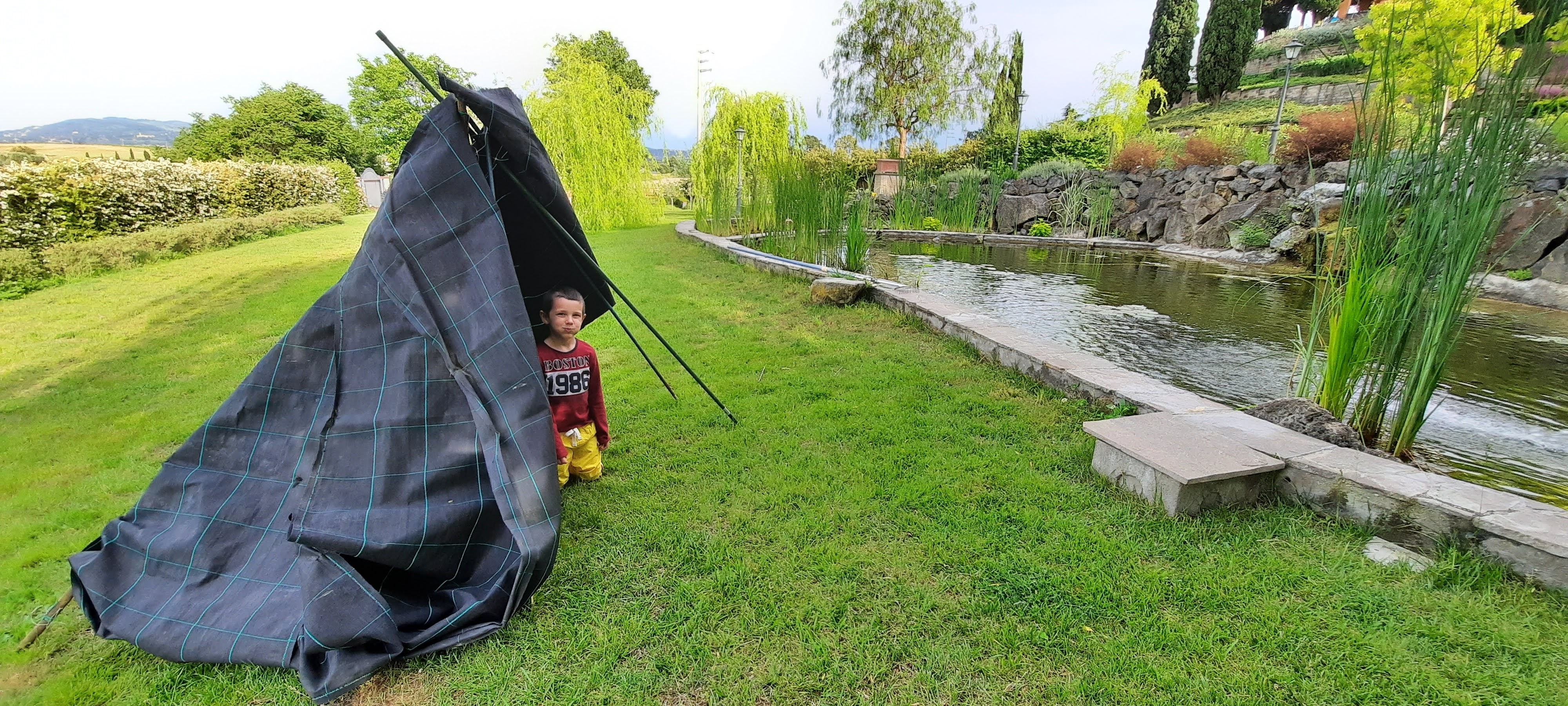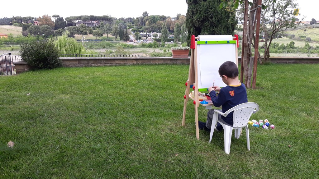 Abbiamo ripreso da tempo a far visita ai nonni. La nonna paterna, durante il Covid19 non è stata bene e – abitando lei a Perugia – non abbiamo potuto raggiungerla tutti quanti insieme per via delle limitazioni agli spostamenti tra regioni. Contiamo di farlo a breve. Inizialmente, ci siamo visti con i miei, con tutte le accortezze del caso e, man mano, con qualche libertà maggiore. Per noi, che viviamo in un appartamento di 80 metri in centro senza terrazzo, passare qualche giorno dai miei genitori è sempre un’occasione per vivere un intenso e approfondito rapporto con la natura. Le cose da fare sono talmente tante che le occasioni per apprendere qualcosa di nuovo non mancano mai. In quest’ultimo mese, ad esempio, ci siamo dedicati all’approfondimento delle tecniche che mio papà usa per tenere lontani gli insetti dagli alberi da frutto; abbiamo iniziato ad utilizzare il microscopio; abbiamo costruito piccoli campeggi in giardino con le tende mobili; abbiamo osservato le rane del laghetto approntando un accampamento sul bordo del lago, dove stavano iniziando a crescere e scorrazzare le più piccoline; abbiamo fatto piccoli lavori di falegnameria e rispolverato sfere Disney dall’armadio (le regalavo io a mia sorella ogni anno a Natale); abbiamo costruito aquiloni di carta fai da te, dipinto balene astratte, tenuto pulito il parco e scoperto un piccolo uovo d’uccello raccogliendo insalata nell’orto…