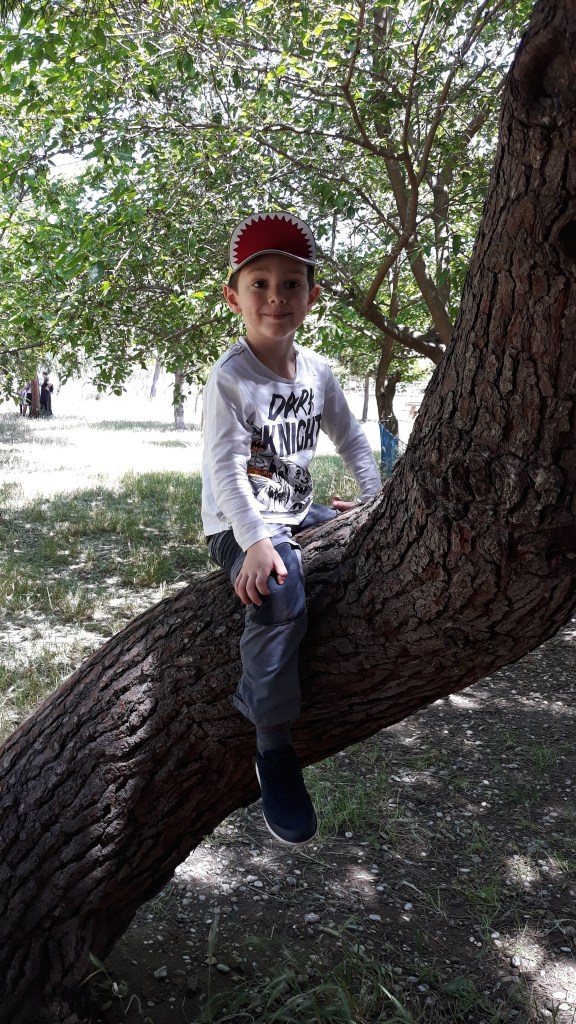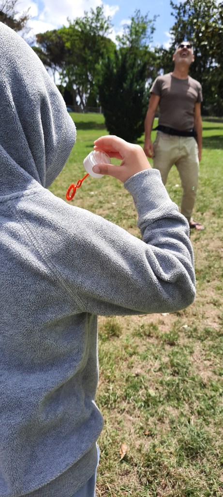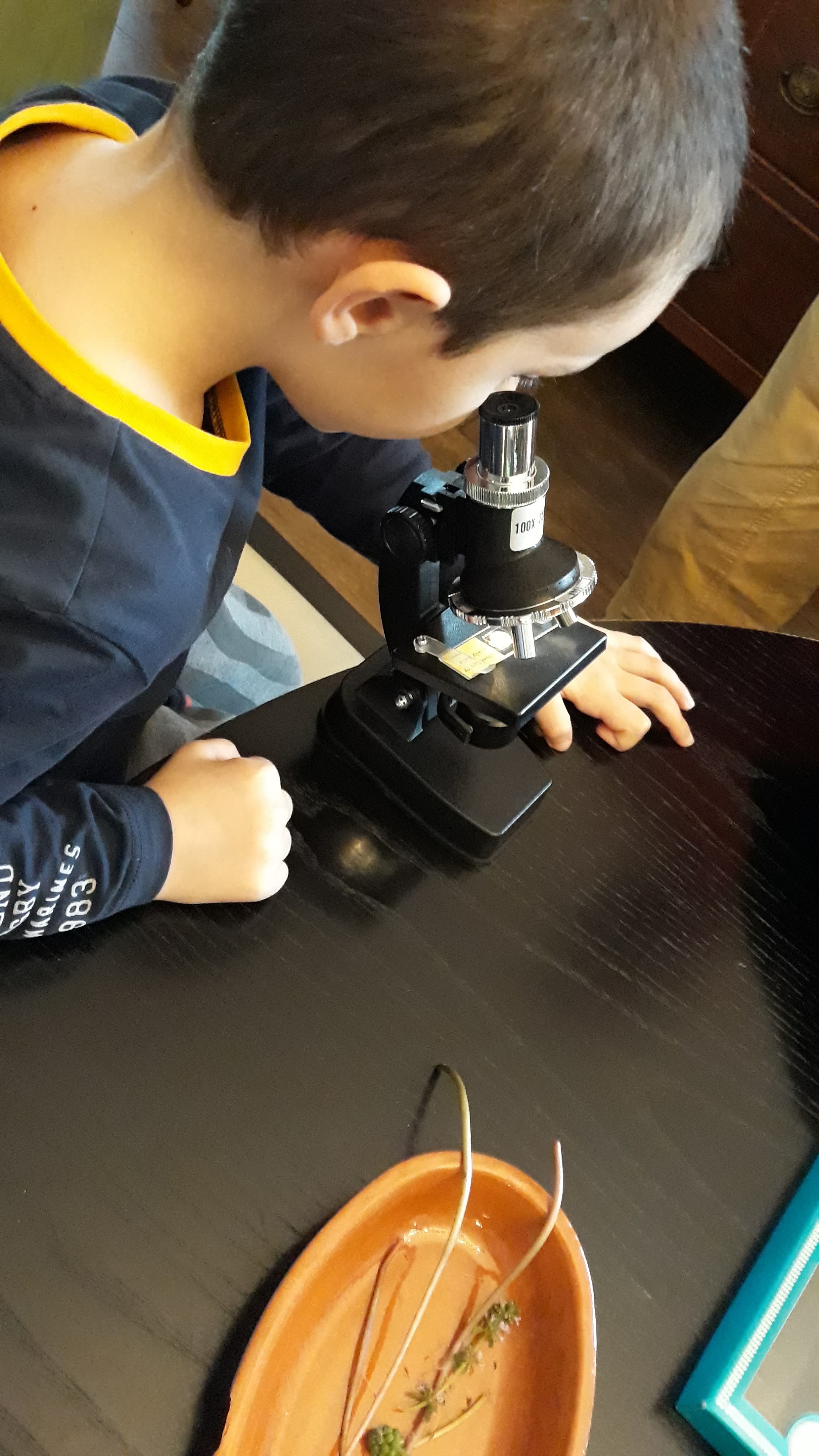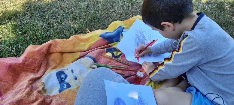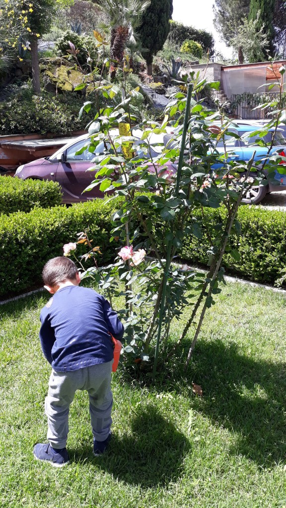 Abbiamo ripreso da tempo a far visita ai nonni. La nonna paterna, durante il Covid19 non è stata bene e – abitando lei a Perugia – non abbiamo potuto raggiungerla tutti quanti insieme per via delle limitazioni agli spostamenti tra regioni. Contiamo di farlo a breve. Inizialmente, ci siamo visti con i miei, con tutte le accortezze del caso e, man mano, con qualche libertà maggiore. Per noi, che viviamo in un appartamento di 80 metri in centro senza terrazzo, passare qualche giorno dai miei genitori è sempre un’occasione per vivere un intenso e approfondito rapporto con la natura. Le cose da fare sono talmente tante che le occasioni per apprendere qualcosa di nuovo non mancano mai. In quest’ultimo mese, ad esempio, ci siamo dedicati all’approfondimento delle tecniche che mio papà usa per tenere lontani gli insetti dagli alberi da frutto; abbiamo iniziato ad utilizzare il microscopio; abbiamo costruito piccoli campeggi in giardino con le tende mobili; abbiamo osservato le rane del laghetto approntando un accampamento sul bordo del lago, dove stavano iniziando a crescere e scorrazzare le più piccoline; abbiamo fatto piccoli lavori di falegnameria e rispolverato sfere Disney dall’armadio (le regalavo io a mia sorella ogni anno a Natale); abbiamo costruito aquiloni di carta fai da te, dipinto balene astratte, tenuto pulito il parco e scoperto un piccolo uovo d’uccello raccogliendo insalata nell’orto…