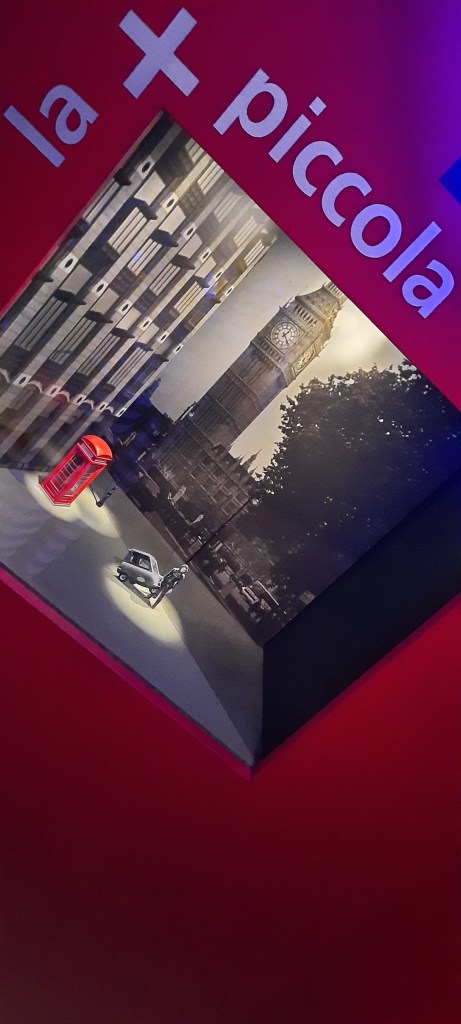 Si tratta di un museo decisamente sorprendente (i fondi privati si fanno ben notare alla grande): molto ben gestite e allestite le tappe, ricchissima la collezione di tutte le epoche, invidiabile la scelta degli accostamenti multidisciplinari, dai video narrativo-interattivi all’interior design, dalla creatività espositiva alle campagne pubblicitarie dell’epoca… insomma, una visita immancabile per chiunque intenda farsi un giro da quelle parti. Noi avevamo a disposizione appena un giorno e mezzo (viaggiando in auto, viaggio compreso!!), perché avevamo deciso di passare anche per Genova avendo a disposizione solo due giorni in tutto, eppure tre quarti della seconda giornata l’abbiamo trascorsa in questo museo. Veramente consigliato! Andandoci, scoprirete di non aver bisogno dei nostri spunti per costruirci sopra un lavoro di approfondimento da trascorrerci dei mesi. Se invece pensate che proprio non ci potrete mai andare, ecco qualche foto a seguire.