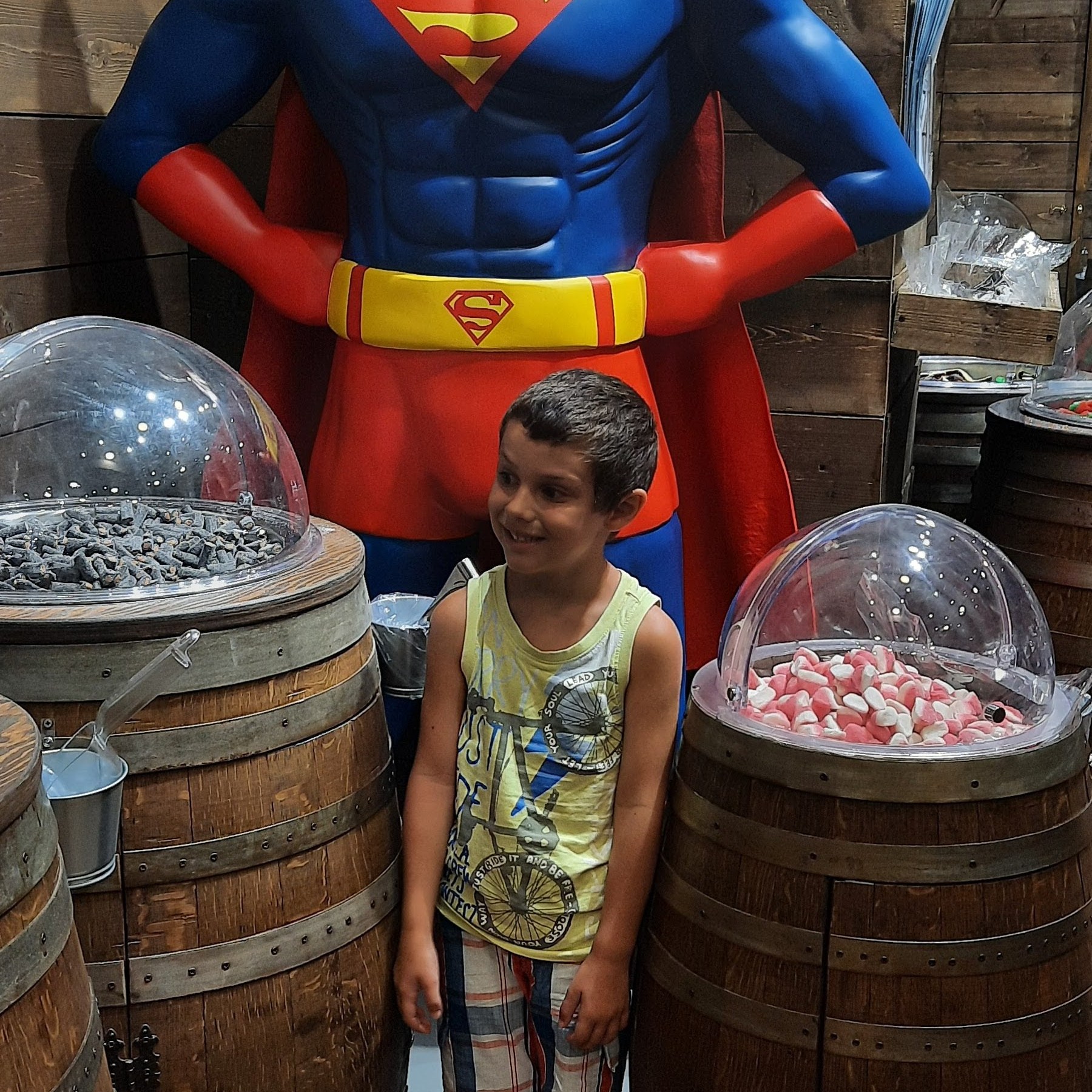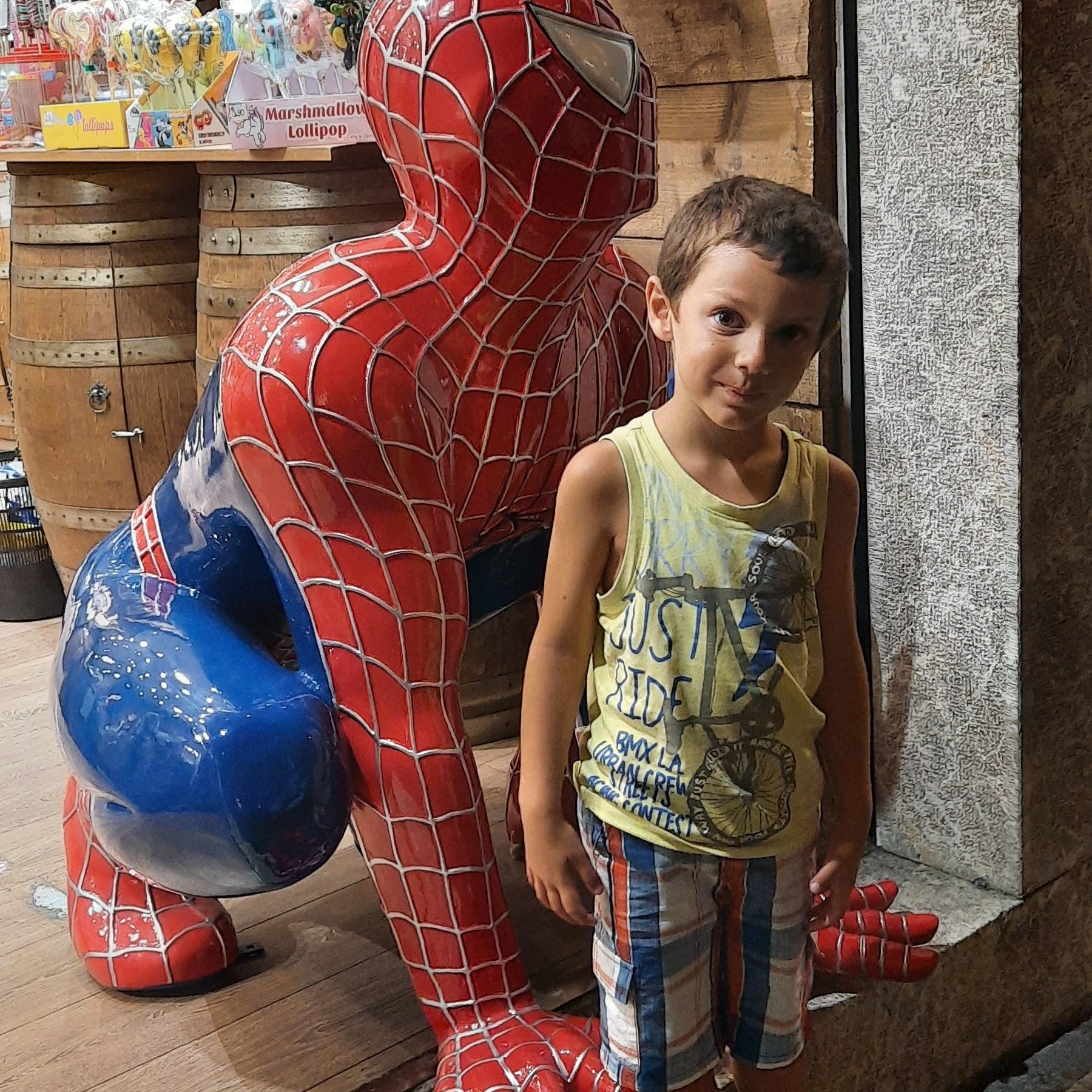 All’arrivo, la prima sera, era tardi ed eravamo stanchi. Abbiamo faticato a trovare un posto in cui mangiare e abbiamo dovuto riportare indietro Samuele in braccio, perché aveva esaurito le sue energie nel percorrere la salita di arrivo al ristorante (qualunque) che alla fine avevamo scelto: qualche selfie con i supereroi in un negozio di caramelle del centro lungo strada e poi a nanna per la gita al mare del giorno dopo.