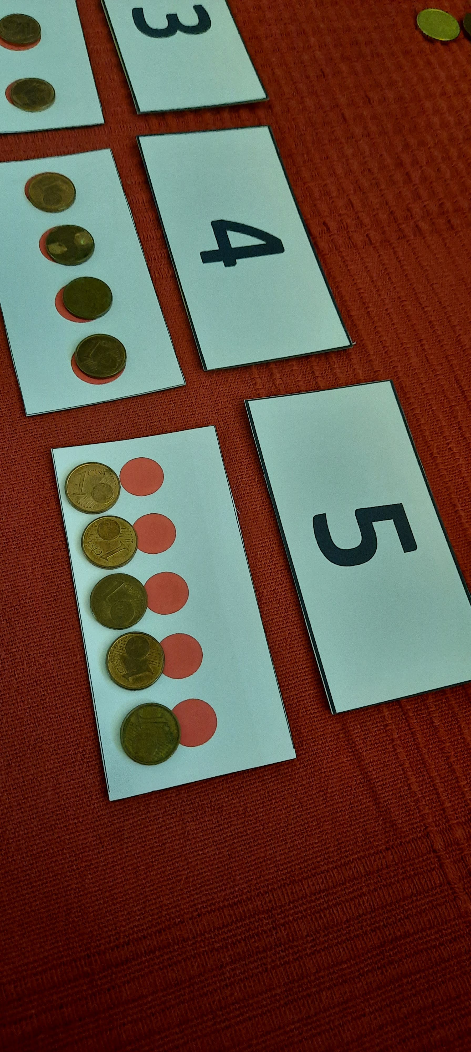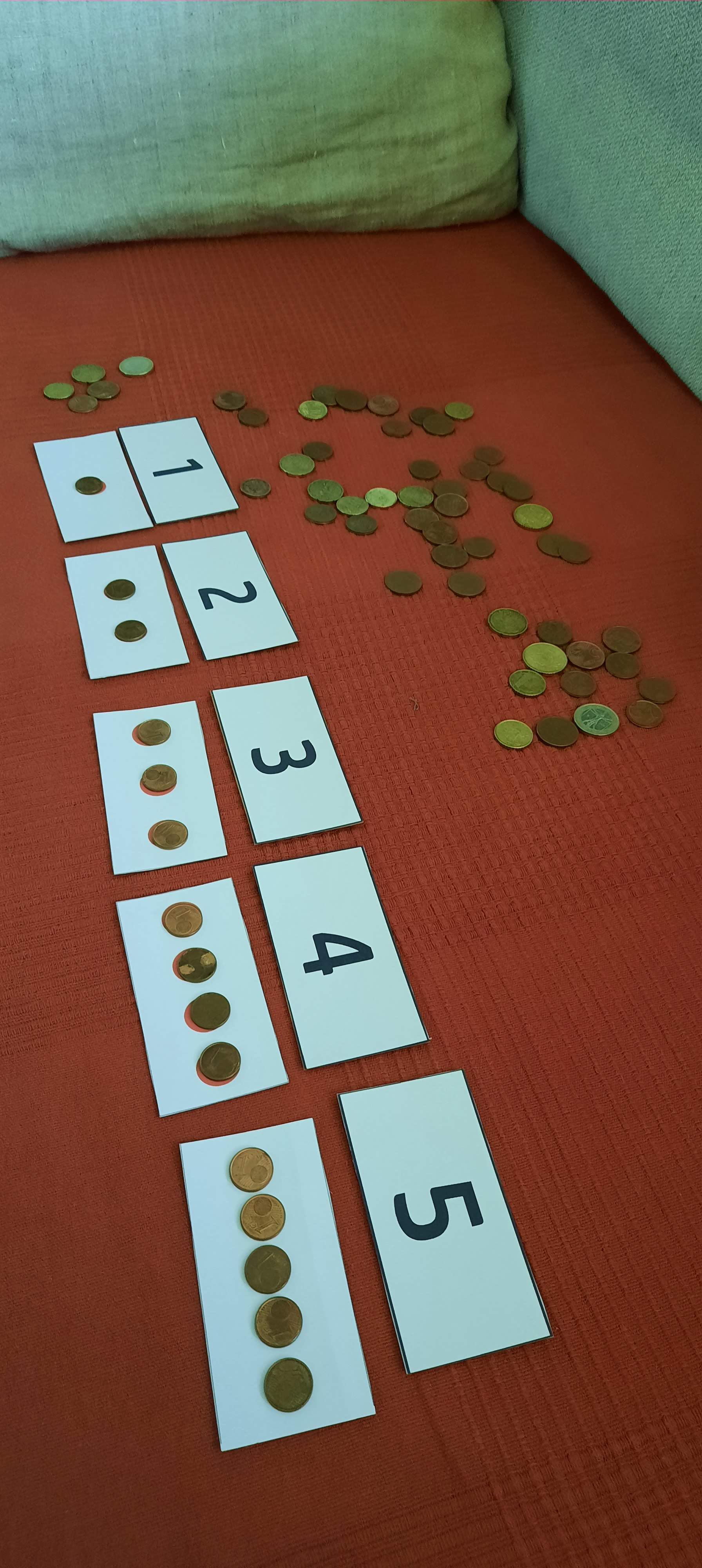 A questo punto, prendete tutte le monete da 1 centesimo e invitateli a disporne una per ogni pallino su tutte le carte, facendo notare ai bambini che sulla moneta è scritto il numero corrispondente al suo valore economico (io lo preciso sempre con Samuele perché spero che assimili presto e bene i diversi significati di valore e che, crescendo, impari a distinguere il valore economico dal valore reale o quello affettivo da quello inestimabile o oggettivo).